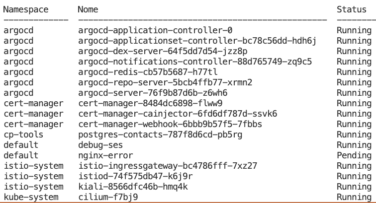 Um dos primeiros passos na automação é obter o status dos recursos. O método list_pod_for_all_namespaces faz exatamente isso.